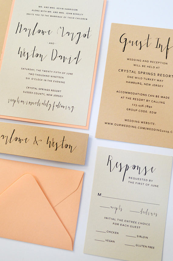 If you want to include more, we love seeing an “our story” page or information about who’s who in the wedding party. It’s a nice way for your guests to get to know everyone involved and give them a little look into why you choose each other. If you are feeling super ambitious, you can also include a bit of a schedule and also recommend nearby attractions/activities for your out of town guests.