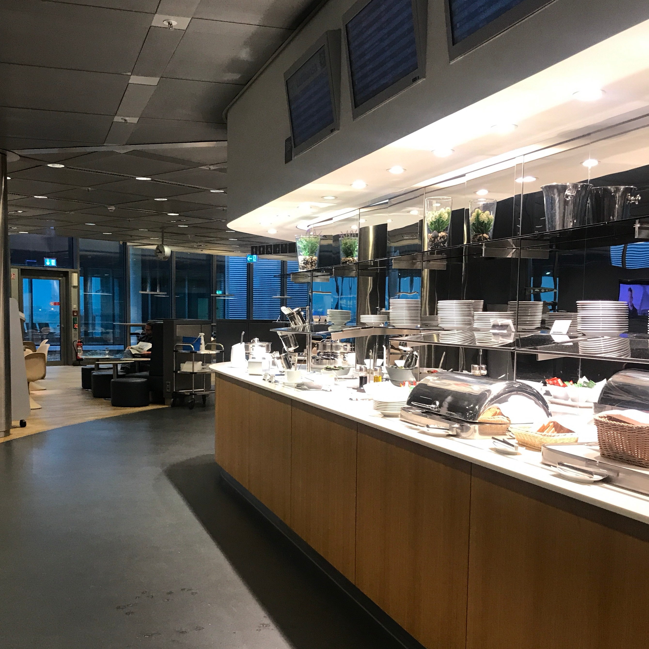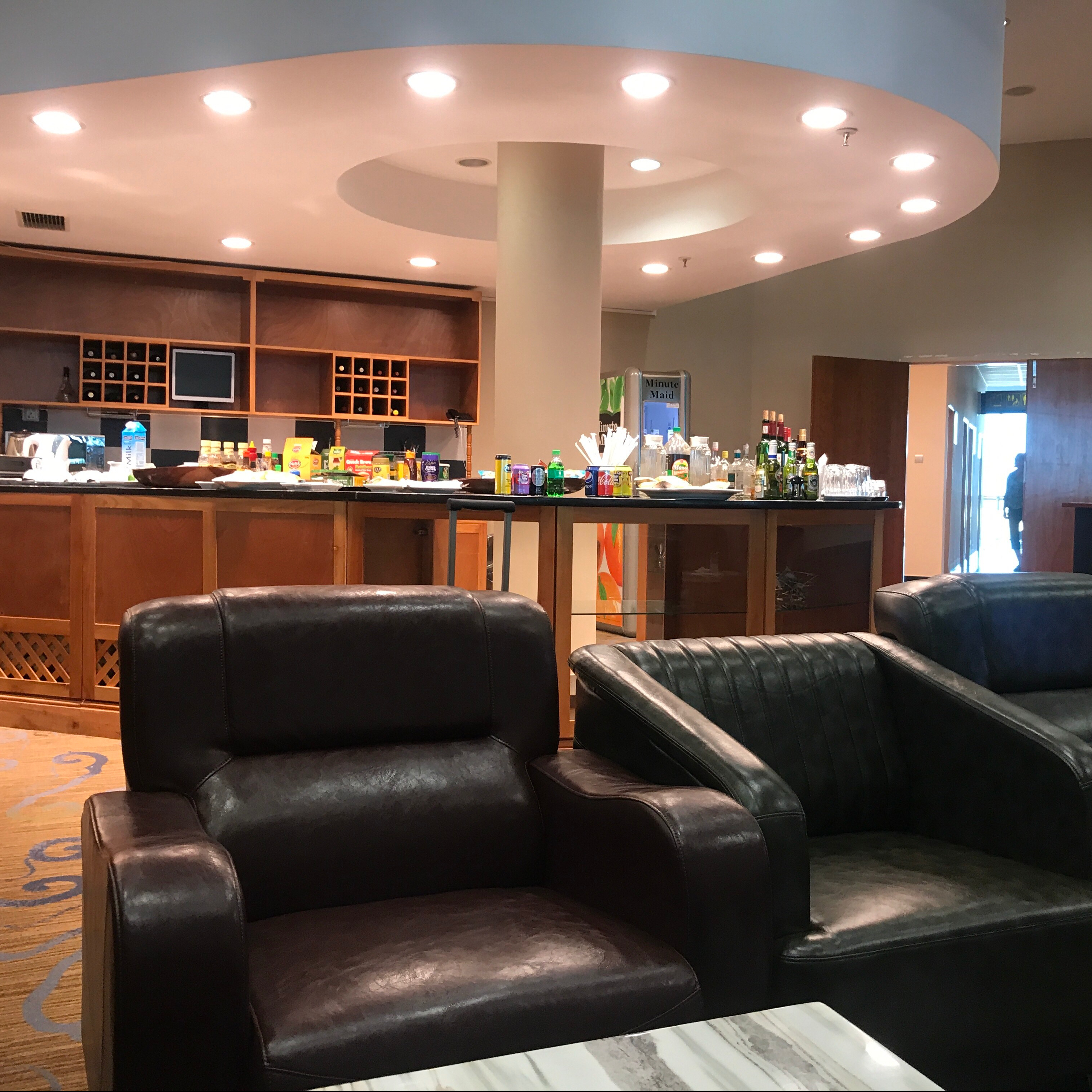 Business class lounges have a range of perks. All of them that I’ve seen offer complimentary bar and hot snacks. Sometimes the bar has a bartender and you can order mixed drinks and such, others have just self-serve beer and wine. Generally, if you don’t see a bartender, it means you can help yourself. Though they do all offer water, sometimes you can’t get bottled water to go, but it doesn’t hurt to ask a staff member if you don’t see it handy.