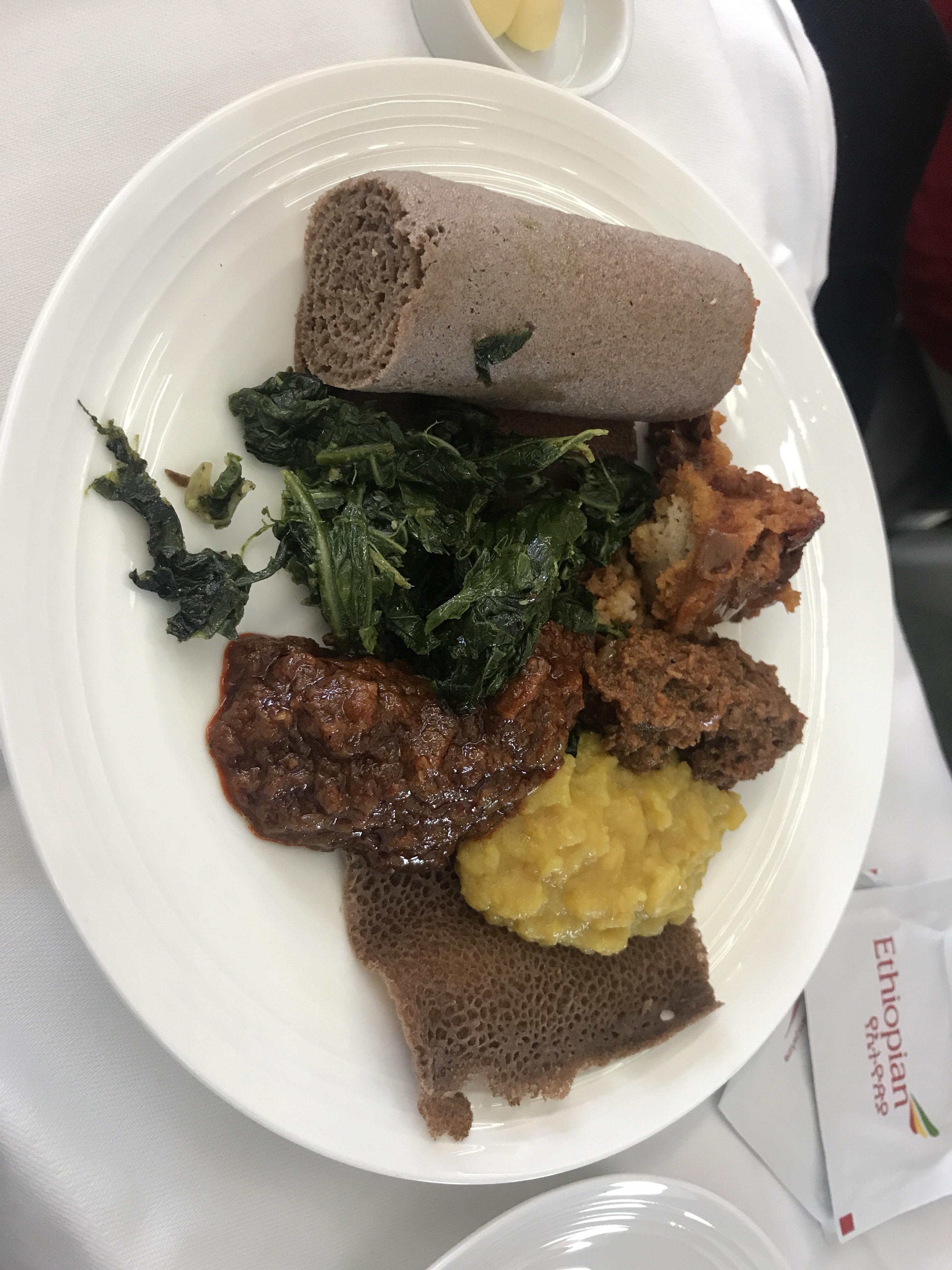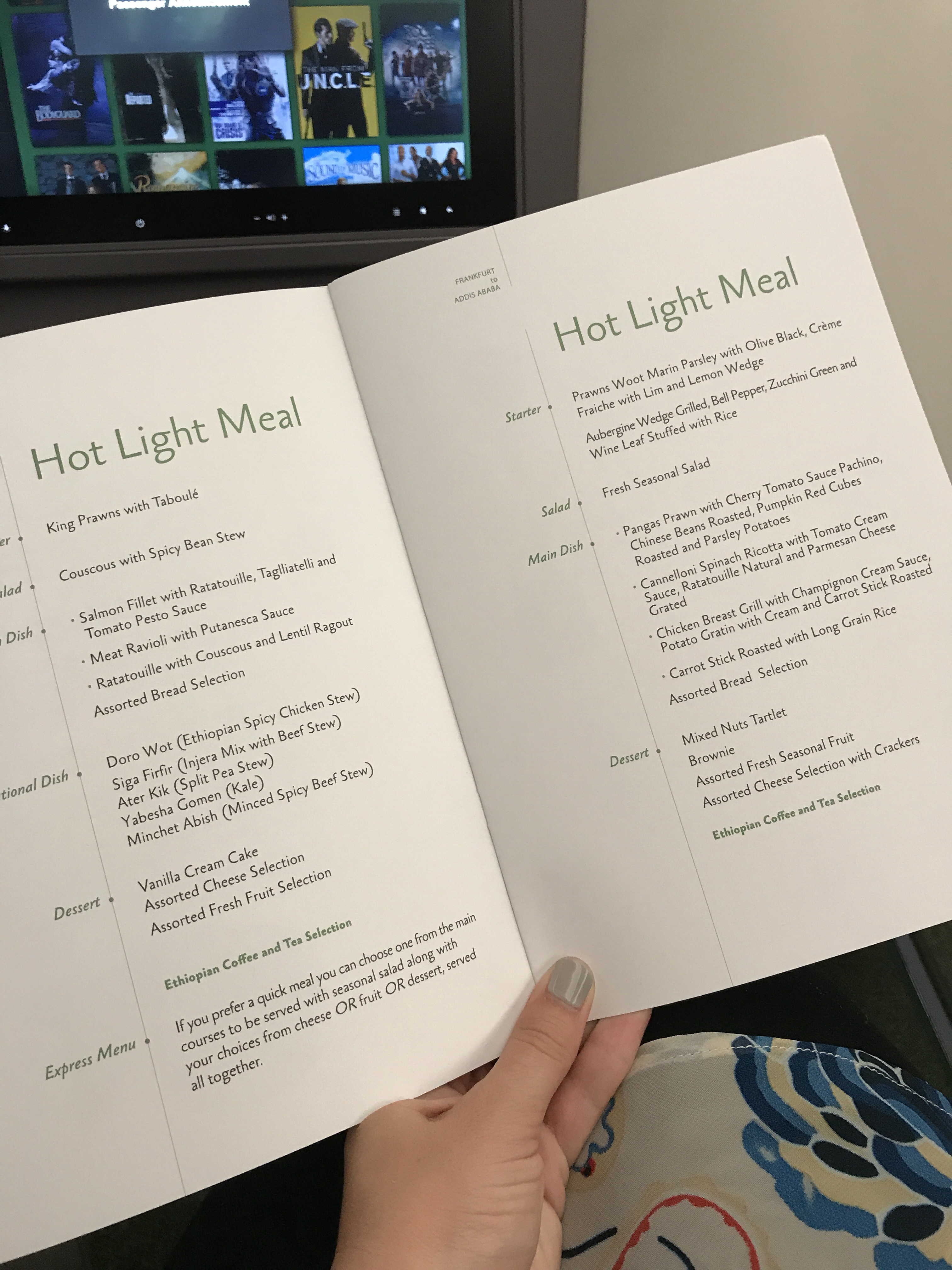 Even during the short flights, we had snacks. On a one and a half hour flight, we were served hot lunch with dessert. On a 7 hour flight, we had a four-course meal including a choice of 4 different Ethiopian dishes or selection of all four! On the long haul flights, we had multiple meals during the journey. Though each time we had more than enough to eat, it seems to be quite acceptable to ask for multiple things off the menu if you want to sample a few.