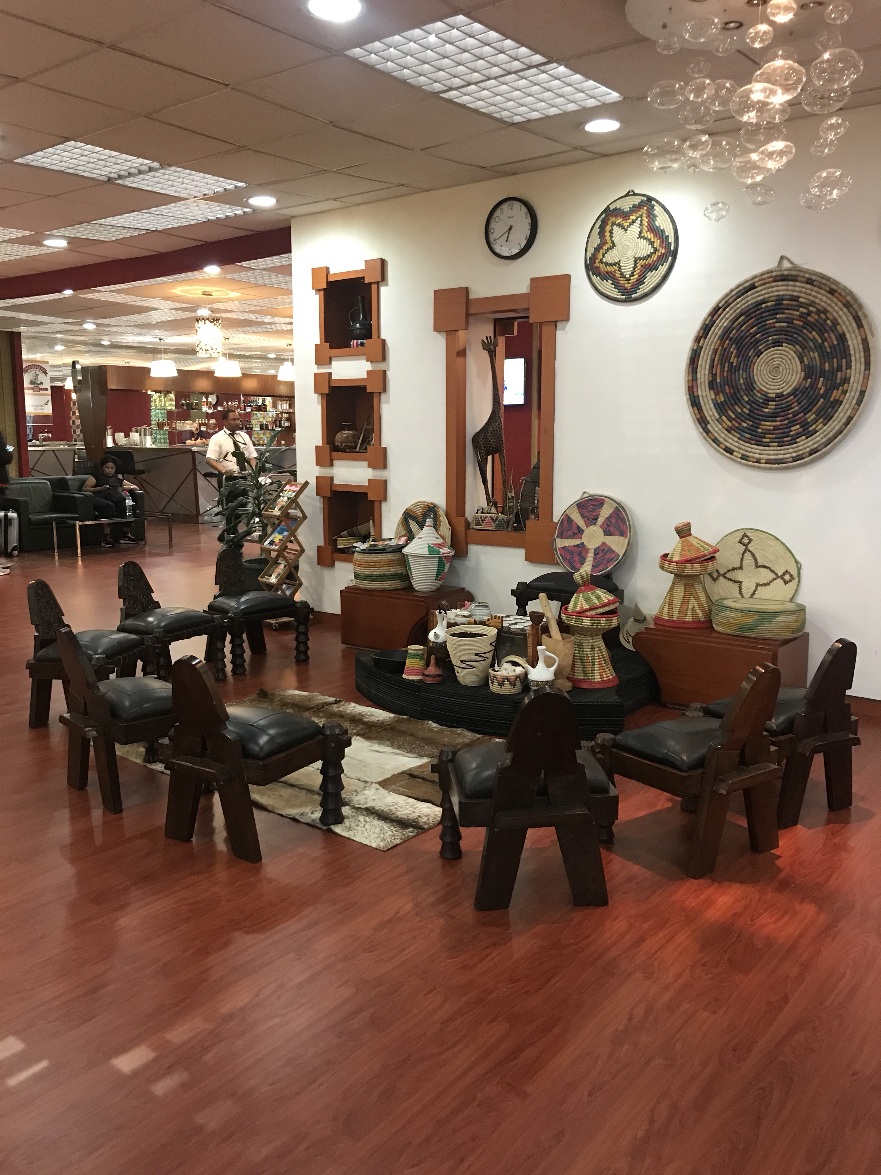 The Ethiopian Airlines Cloud Nine Lounge in Addis Ababa offered a special coffee lesson (pictured below). You can sit down and they will brew Ethiopian coffee in the traditional way and let you ask questions and sample it. I am sure many other lounges offer special perks like this, but this was the most unique thing we saw in a lounge on our trip.