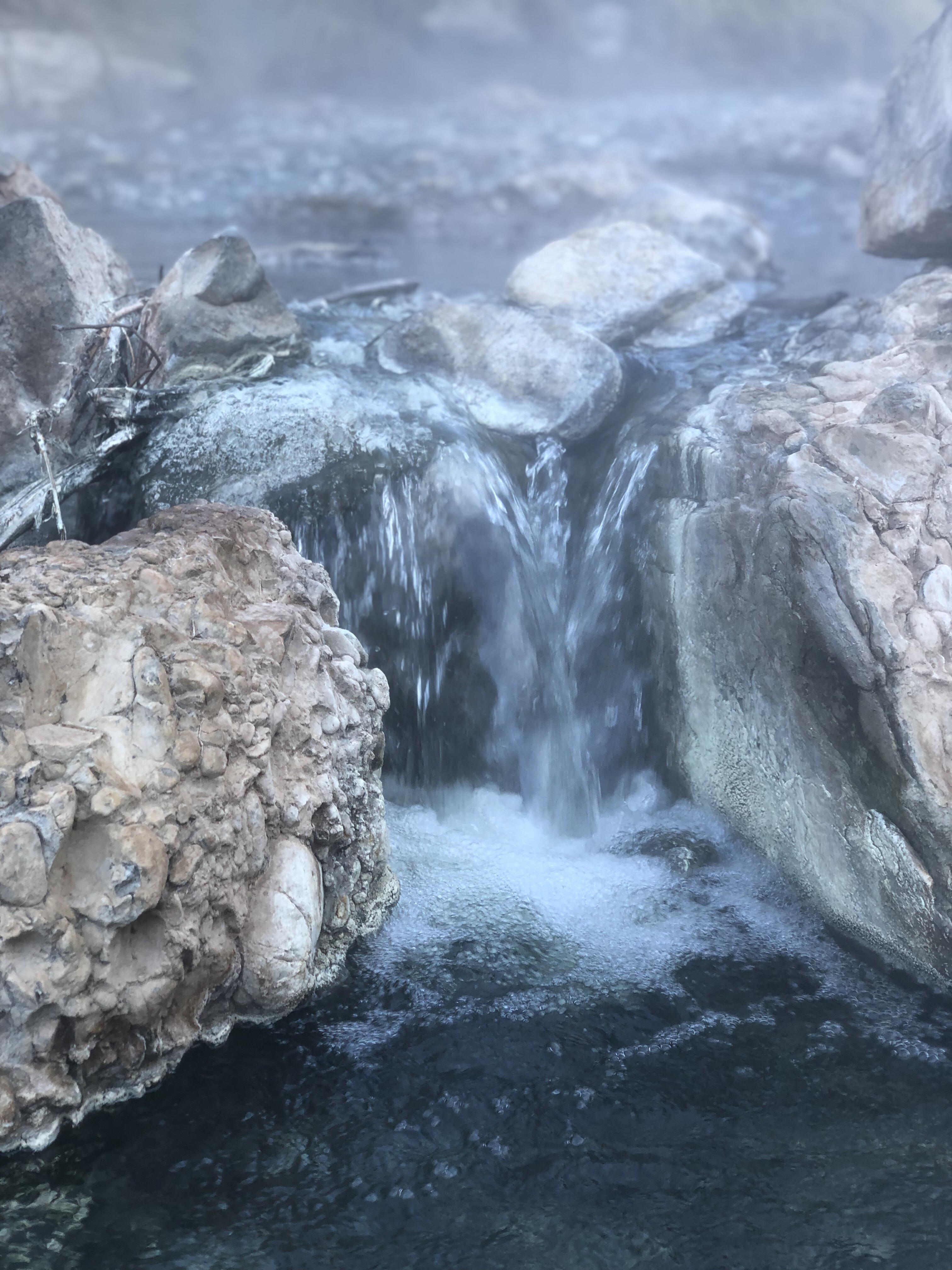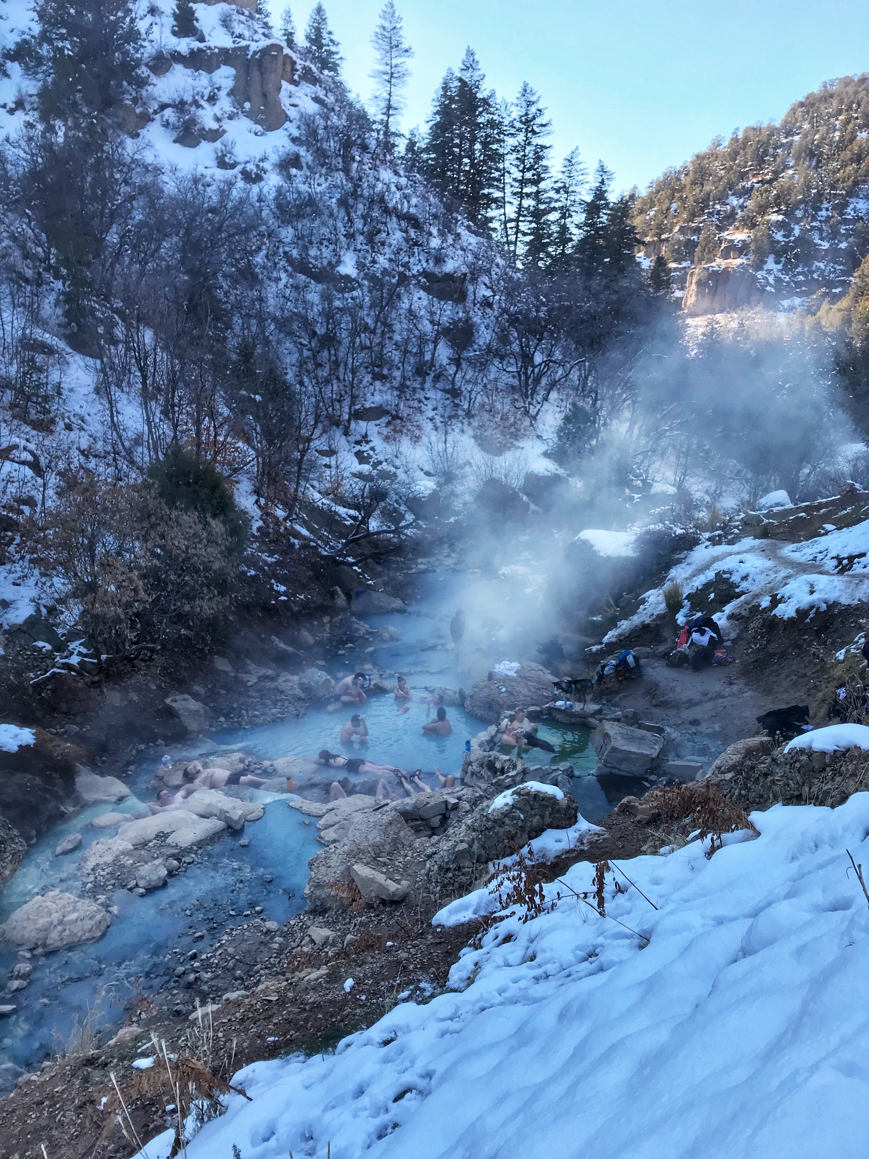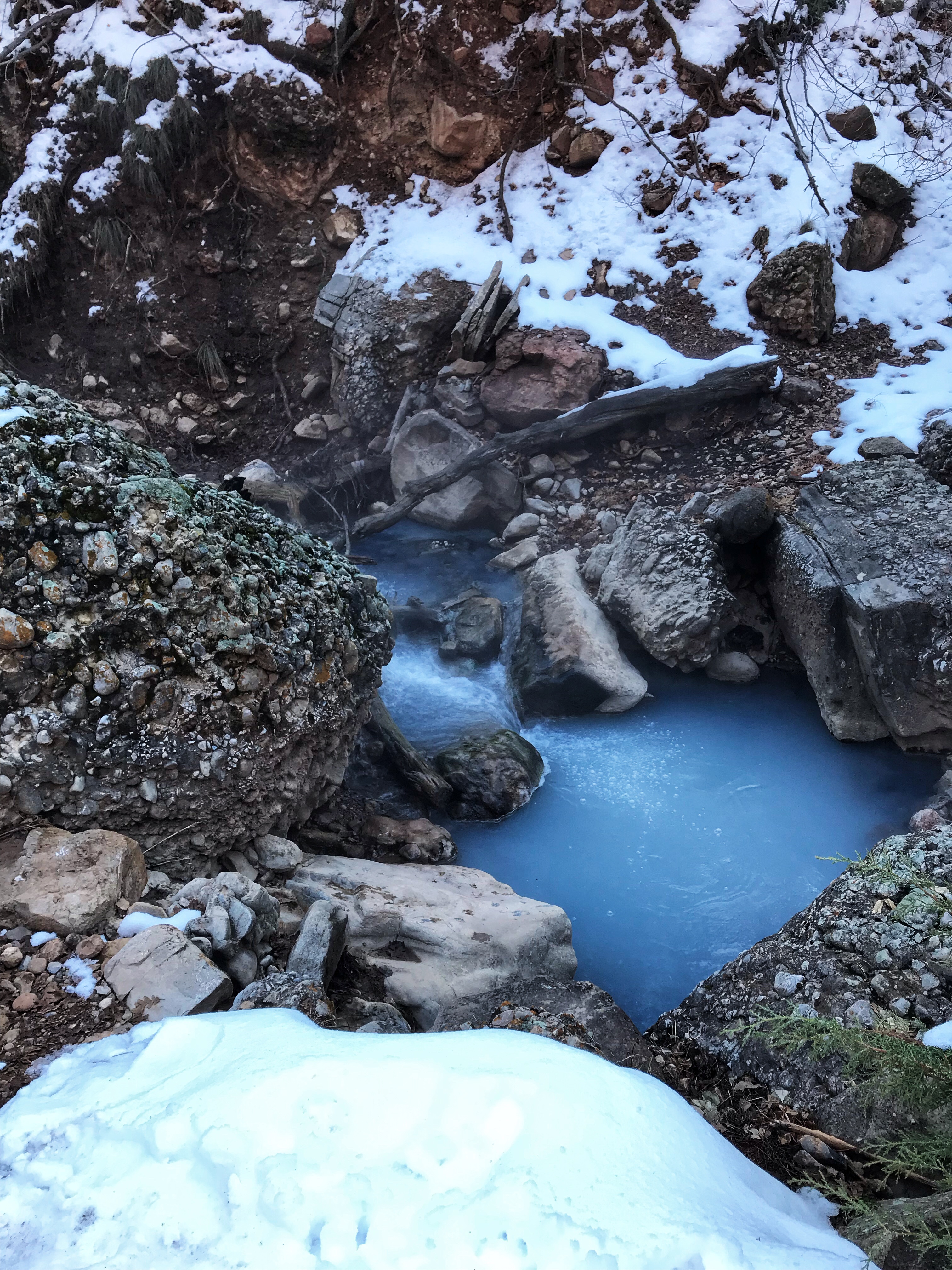 The hot springs were a 2-3mile (depending on road closures) one-way hike into the mountains. There was a decent amount of ice/snow on the ground so it was fairly slow going for us on the way in. The natural hot springs were beautiful bright blue and green and the water felt hotter than a hot tub. It smelled terrible (because of the sulfur) but we got used to it and greatly enjoyed our time there.
